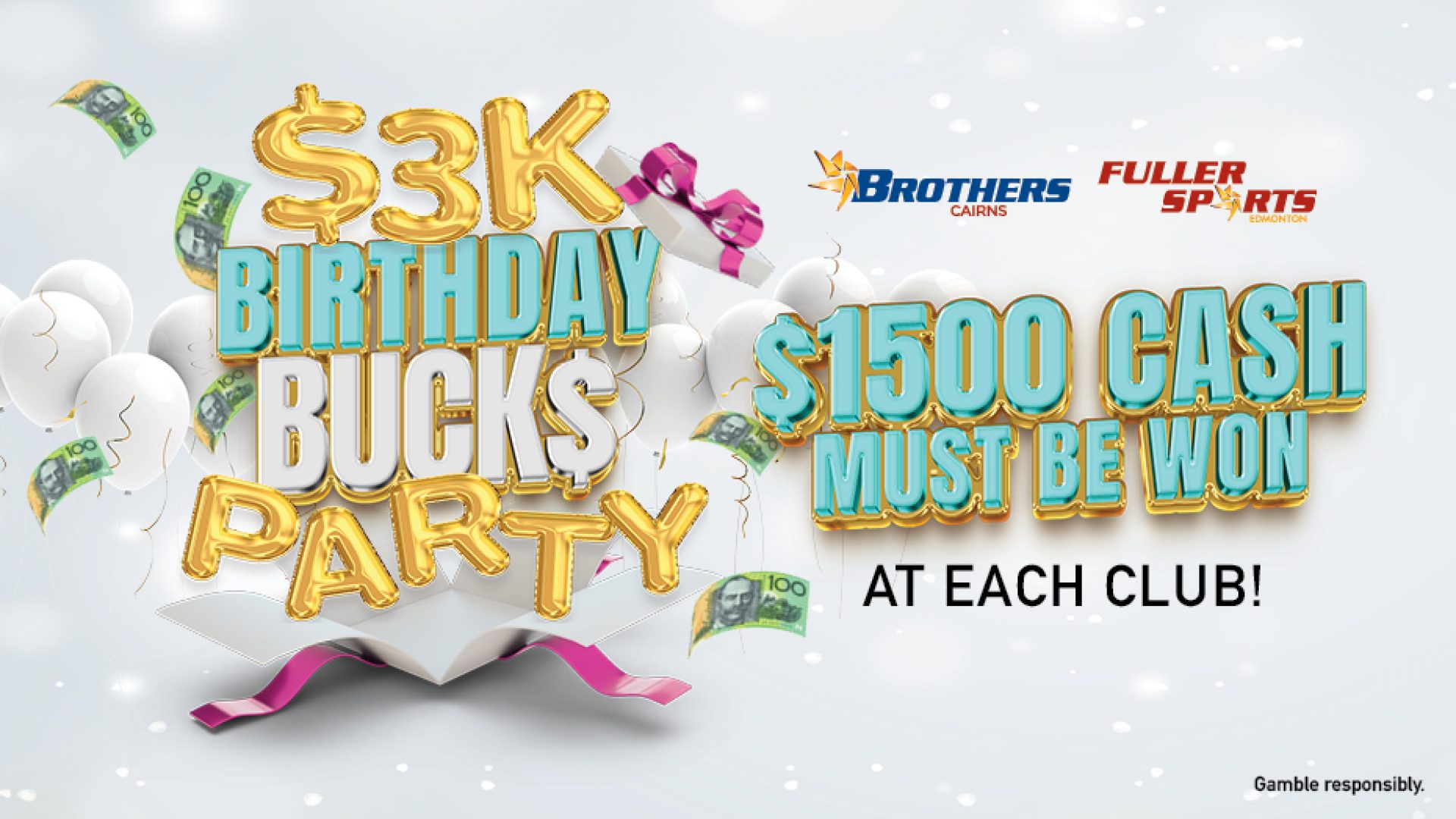 Join us the last Thursday of every month either here at Brothers or at Fuller Sports Club to win a share in $1,500 CASH to be won in each Club!
