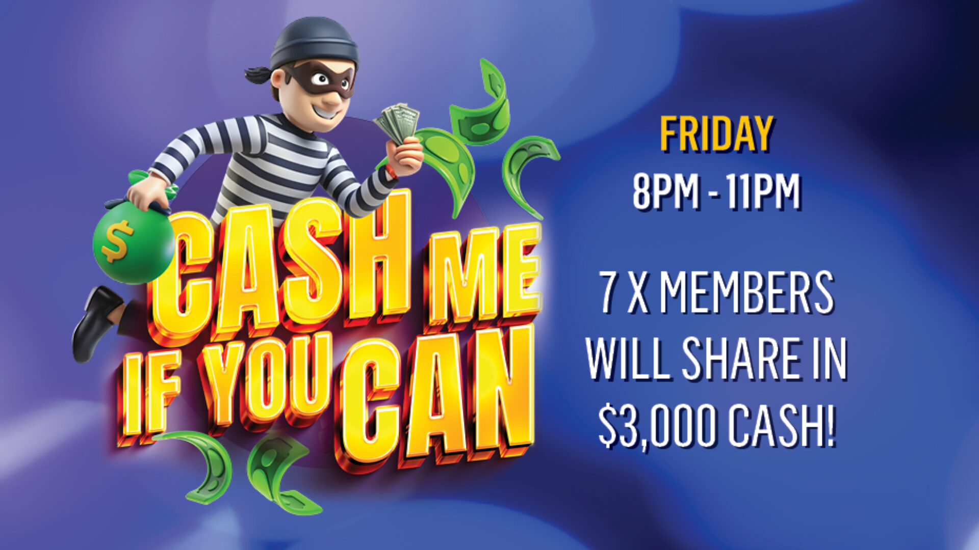 Each week, 7x lucky members will win a share of $3,000 CASH in our Cash Me If You Can weekly gaming promotion.